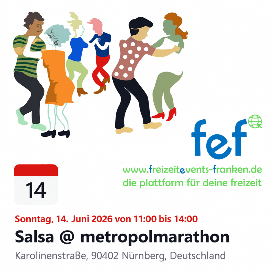 | | | | Beschreibung: | Wir motivieren die Läufer des Metropolmarathon mit bester Musik, fröhlichem Tanz und ausgelassener Stimmung. Von 11:00 bis 14:00 glühen auch unsere Sohlen bei Salsa, Rueda und Bachata. Auf Wunsch gerne auch ein Samba, ChaCha, Jive oder Discofox. Zum Abschluss ein Walzer, so geht FEF.